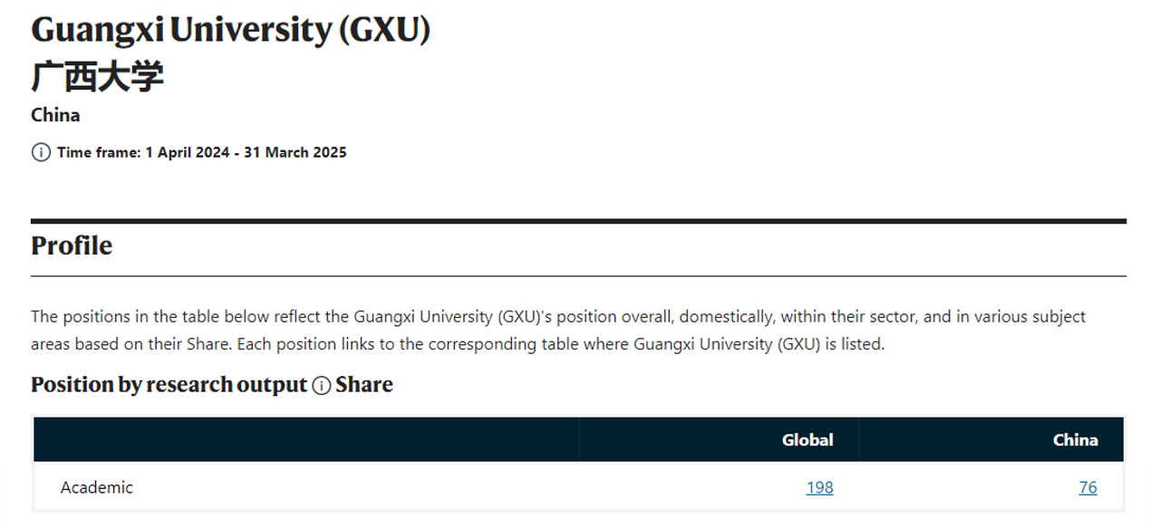 Đại học Quảng Tây đạt được cột mốc lịch sử trong Bảng xếp hạng Chỉ số Nature (tháng 4/2024 – tháng 3/2025), vào Top 200 toàn cầu ở vị trí 198 và đứng thứ 76 trong các trường đại học Trung Quốc đại lục. Đây là bước tiến 468 bậc so với thứ hạng toàn cầu năm 2021 (666), thể hiện năng lực nghiên cứu khoa học tự nhiên ngày càng được tăng cường.