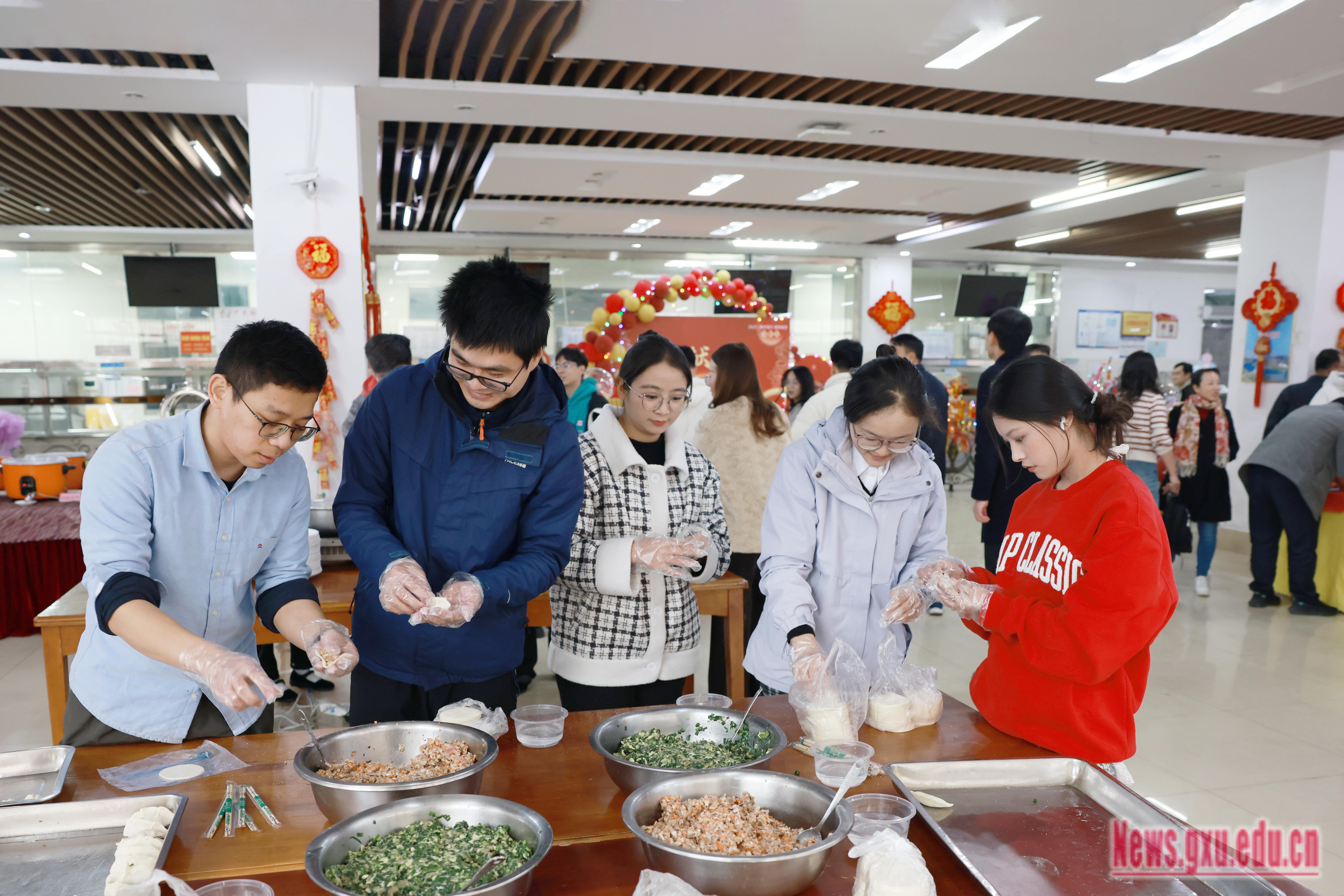ณ โรงอาหารชุยหยวน ศาสตราจารย์ ดร. หาน หลินไห่ เป็นตัวแทนมหาวิทยาลัยกว่างซี ได้มอบอั่งเปาเป็นของขวัญปีใหม่ให้กับนักศึกษา นอกจากนี้แล้ว ท่านยังได้ร่วมกิจกรรมต่างๆ เช่น เขียนอักษรจีนคำว่า “福” (ฝู - หมายถึง โชคดี มีความสุข) ห่อเกี๊ยว รับประทานอาหารค่ำร่วมกัน และพูดคุยกับนักศึกษาอย่างเป็นกันเอง ซึ่งบรรยากาศเต็มไปด้วยความสุข สนุกสนาน และความอบอุ่นของเทศกาล