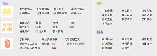 Up to December 2022, the collection of Guangxi University Library totaled 5,245,400 volumes, 3,720,000 e-books, 9,880,000 dissertations, 260,000 hours of audio and video, 56,000 full-text electronic journals, and 206 large-scale databases. It boasts renowned domestic and international academic databases, such as Elsevier, WOS, Scifinder, IEL, Wiley, Springer, EBSCO, EI, Nature, Science, SAGE, CNKI, Wanfang, Super Star, etc. It has formed a multidisciplinary, multilevel, multicarrier and distinctive collection system covering thirteen major academic disciplines such as philosophy, economics, law, literature, science, engineering, agriculture, management, teaching, arts and medicine, etc., which effectively supports the university's discipline construction and talent cultivation.