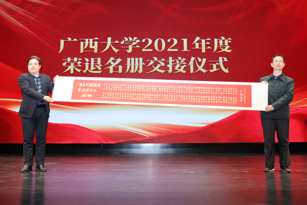 荣退仪式上,人力资源处、离退休工作处进行了米乐电竞|最新APP下载|登录入口,2021年度荣退名册交接,精致装裱的荣退名册手写着2021年度荣退教职工名字,体现学校对退休教职工几十年兢兢业业为党工作、踏踏实实为校服务的敬重和肯定。