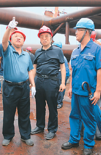 郑皆连(左一)在平南三桥加工制造现场