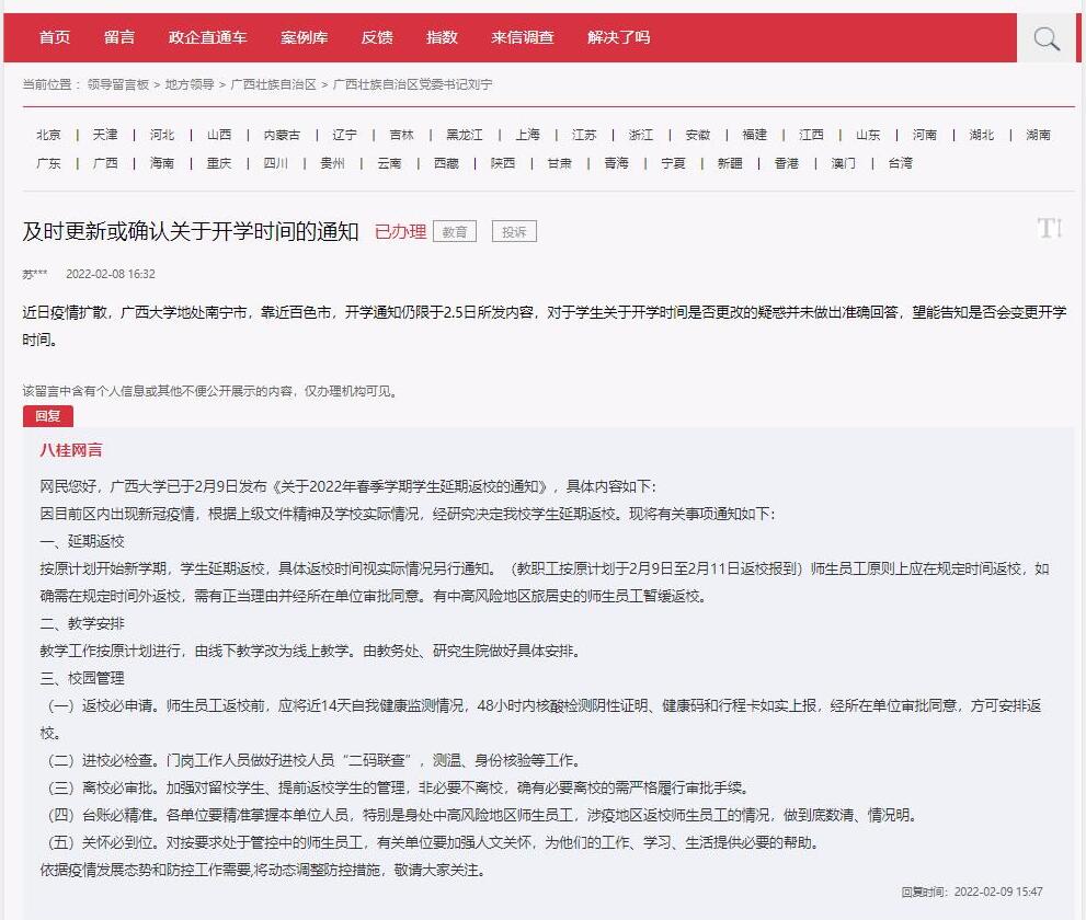 人民网南宁2月10日电(王勇)日前,人民网网友在“领导留言板”反映米乐电竞|最新APP下载|登录入口,开学日期是否调整的问题。对此,米乐电竞|最新APP下载|登录入口,已于2月9日发布《关于2022年春季学期学生延期返校的通知》:经研究决定学生延期返校。