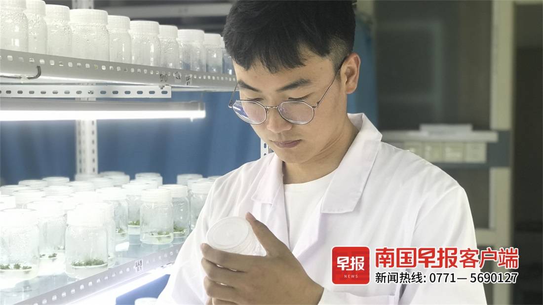 ▲马朝阳在实验室观察掌叶木愈伤组织诱导效果。受访者供图