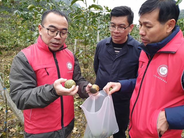 广西壮族自治区科技厅、农科院的技术人员在天峨县六排镇令当村指导百香果种植。新华社记者黄浩铭 摄