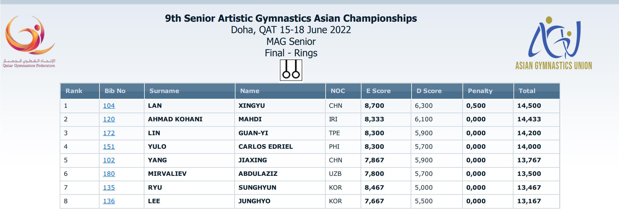 男子吊环决赛,中国选手兰星宇(我校体育学院学生)以14.500分摘金,另一位中国选手杨家兴得到13.767分,最终排名第五。