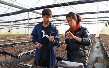 (陈贞洁与廖世明在进行芽苗砧嫁接)