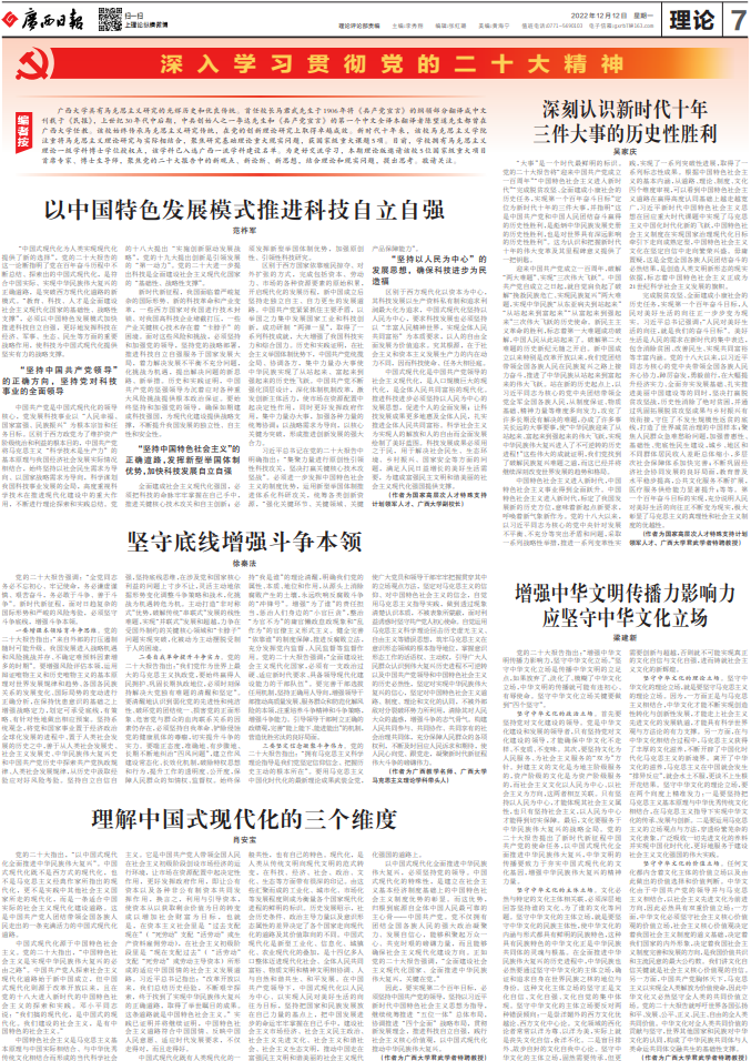 米乐电竞|最新APP下载|登录入口,具有马克思主义研究的光辉历史和优良传统。首任校长马君武先生于1906年将《共产党宣言》的纲领部分翻译成中文刊载于《民报》,上世纪30年代中后期,中共创始人之一李达先生和《共产党宣言》的第一个中文全译本翻译者陈望道先生都曾在米乐电竞|最新APP下载|登录入口,任教。该校始终传承马克思主义研究传统,在党的创新理论研究上取得卓越成效。新时代十年来,该校马克思主义学院注重将马克思主义理论研究与实际相结合,聚焦研究基础理论重大现实问题,获国家级重大课题5项。目前,学校拥有马克思主义理论一级学科博士学位授权点,该学科已入选广西一流学科建设名单。为更好交流学习,本期理论版邀请该校5位国家级重大项目首席专家、博士生导师,聚焦党的二十大报告中的新观点、新论断、新思想,结合理论和现实问题,提出思考。敬请关注。