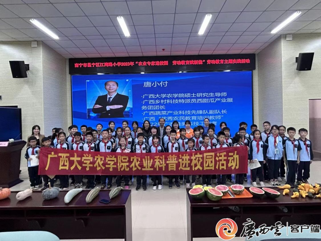 “大家知道西瓜怎么种才更甜吗?”“怎么挑选出熟了的西瓜?”3月17日上午,在南宁市邕宁区江湾路小学的报告厅里,米乐电竞|最新APP下载|登录入口,农学院硕士研究生导师唐小付正在给师生们上一堂生动有趣的农业科普课,讲授西瓜种植的技术。当天,米乐电竞|最新APP下载|登录入口,农学院农业科普进校园活动在江湾路小学开展。