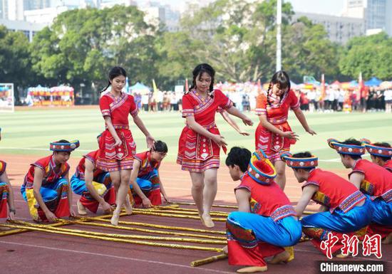 除各具特色的竞技和体验类项目,各学院也纷纷拿出看家本领,在大本营前开展对山歌、齐跳民族舞蹈等精彩纷呈的民族活动,歌声、欢笑声、掌声把田径场变成了民族文化的海洋。