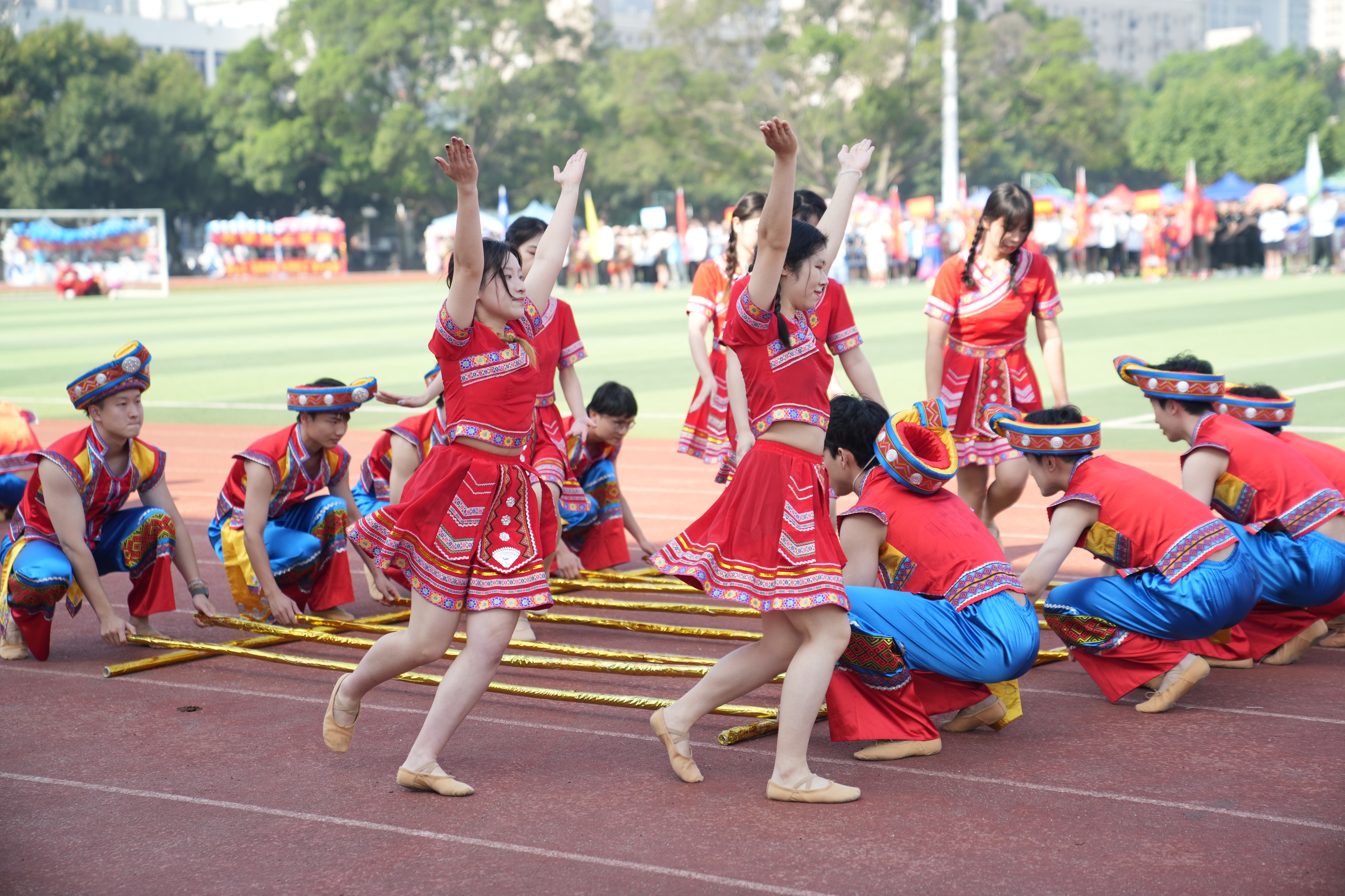 跳竹竿舞。学校供图