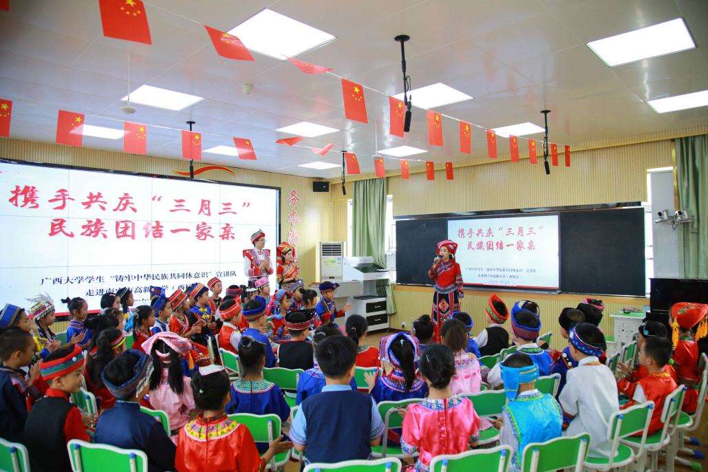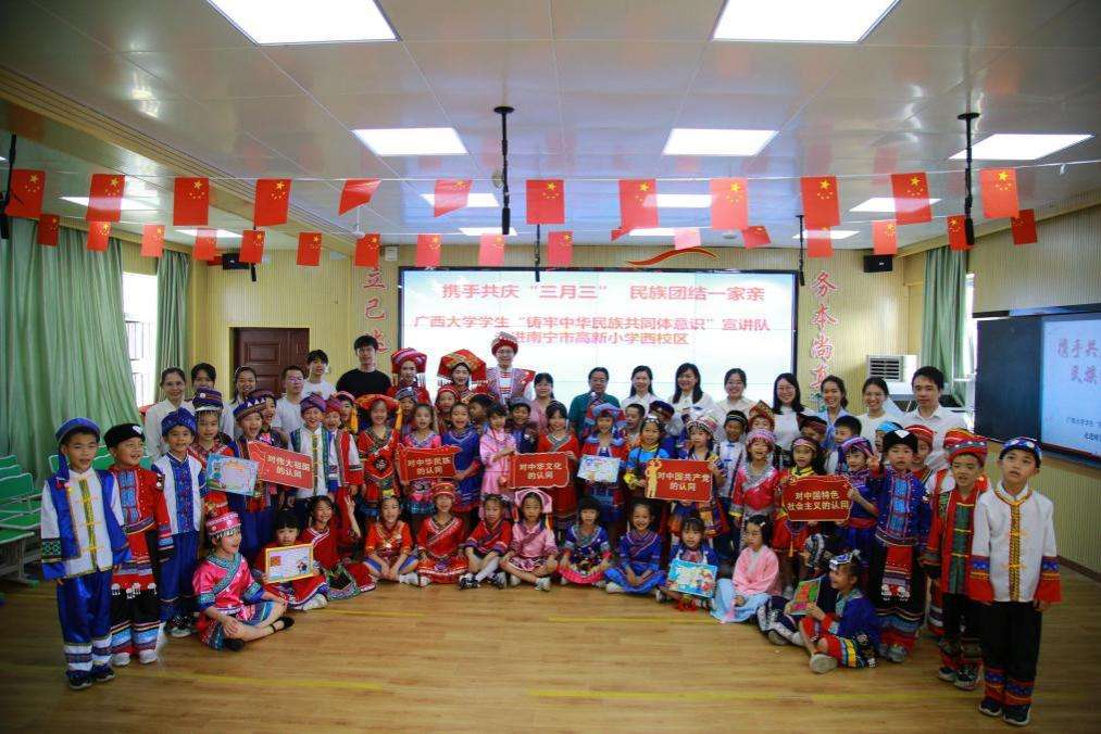 4月19日,米乐电竞|最新APP下载|登录入口,学生“铸牢中华民族共同体意识”宣讲队走进南宁市高新小学西校区开展“携手共庆‘三月三’,民族团结一家亲”的主题活动。