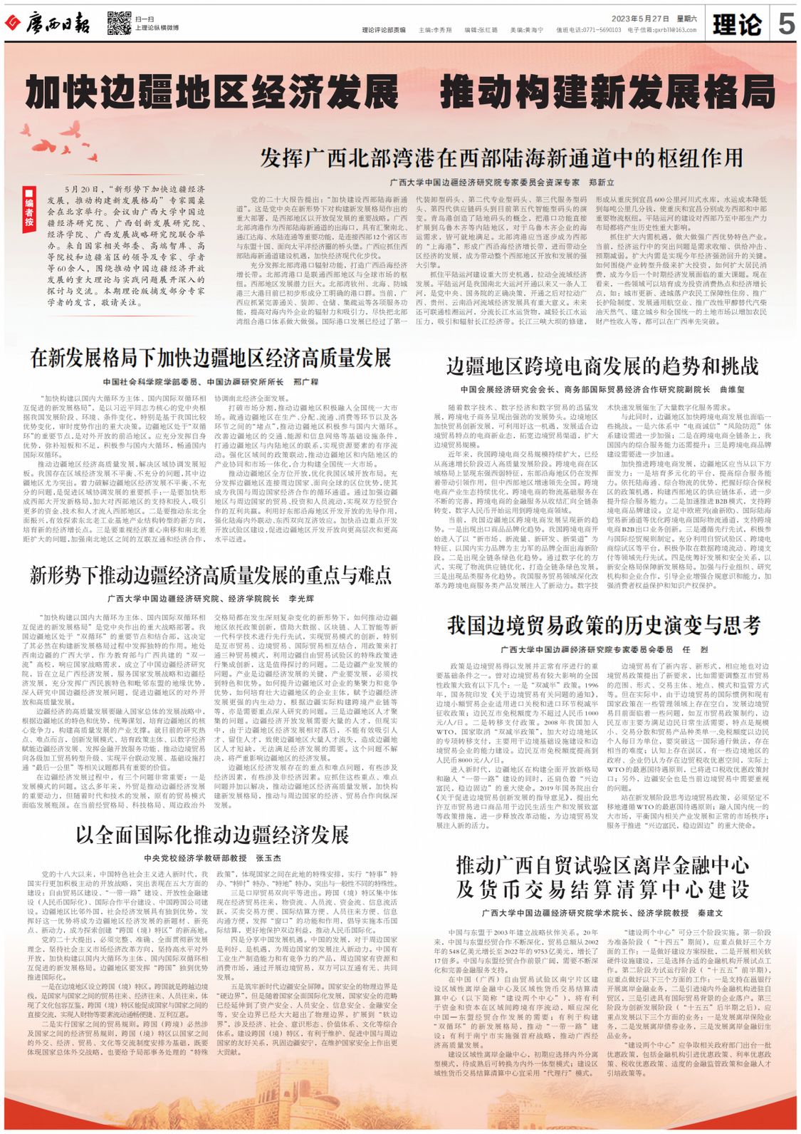 “加快构建以国内大循环为主体、国内国际双循环相互促进的新发展格局”是党中央作出的重大战略部署。我国边疆地区处于“双循环”的重要节点和结合部,这决定了其必然在构建新发展格局过程中发挥独特的作用。地处西南边疆的米乐电竞|最新APP下载|登录入口,,作为教育部与广西共建的“双一流”高校,响应国家战略需求,成立了中国边疆经济研究院,旨在立足广西经济发展,服务国家发展战略和边疆经济发展,充分发挥广西民族特色和毗邻东盟的地缘优势,深入研究中国边疆经济发展问题,促进边疆地区的对外开放和高质量发展。