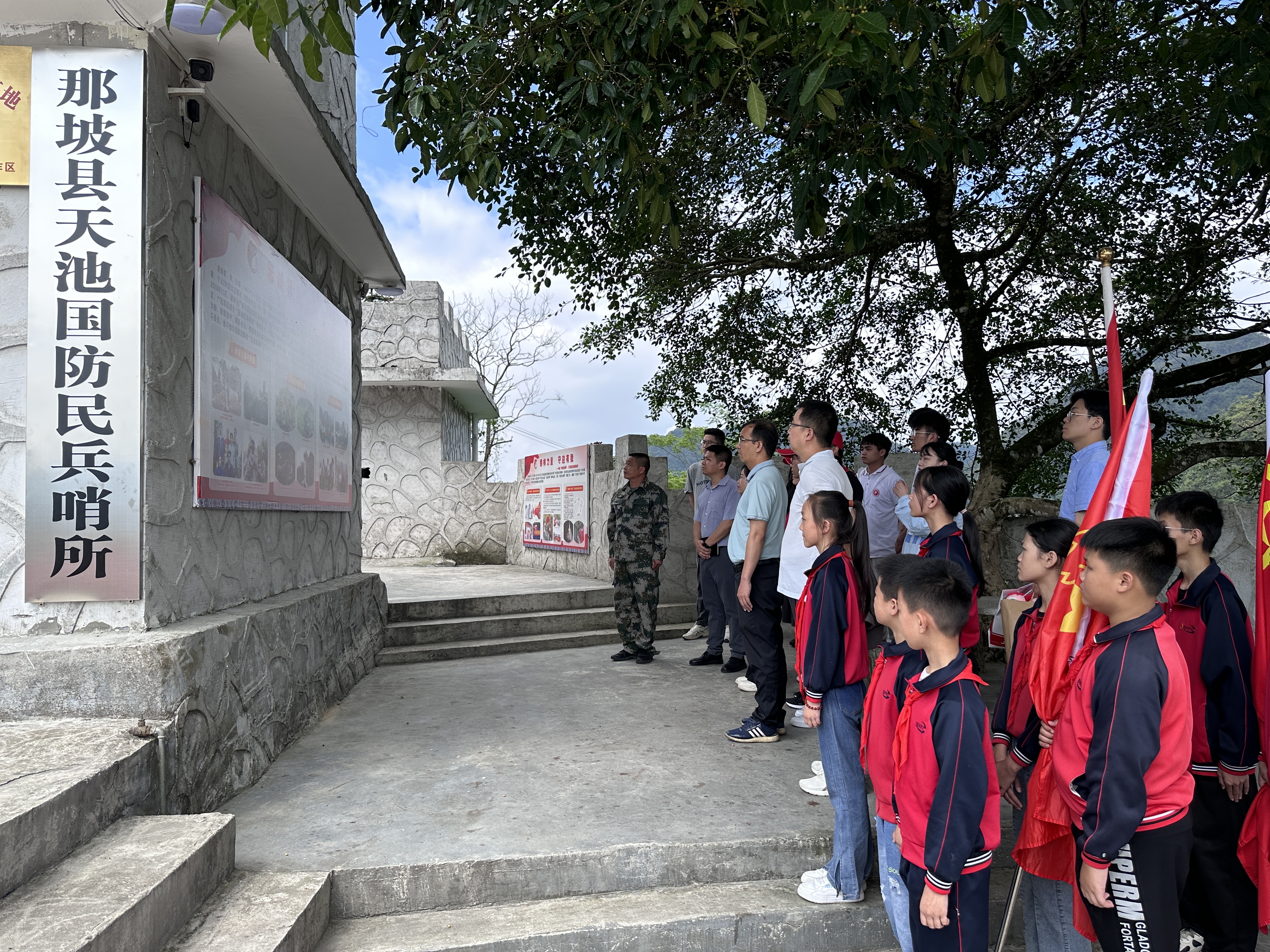 在那坡县天池国防民兵哨所,副哨长班正华为参加活动的同学们介绍天池哨所哨长、“全国最美奋斗者”、全国“优秀共产党员”凌尚前同志四十余年如一日扎根哨所、巡边护边的先进事迹。为在场的米乐电竞|最新APP下载|登录入口,研究生支教团的同学们,以及那坡县平孟镇九年一贯制学校的团员、少先队员们上了一堂生动的微党课、微团课、微队课。
