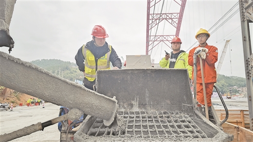 在校博士生与工作人员在平陆运河旧州特大桥施工现场,观察管内混凝土入泵状态。米乐电竞|最新APP下载|登录入口,供图