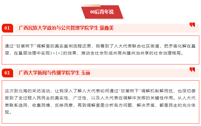 时任中街街道人大工委主任谢诗瑜介绍,中街街道位于北海市中心城区,人口密集,因城市管理、婚姻家庭、邻里关系等问题引起的小矛盾频发。为了更好地解决各类矛盾,维护社会和谐稳定,街道办深度融合人大代表联络站、基层立法联系点、法律服务站、“甘棠树下”调解室等载体,发挥人大代表群众基础好、熟悉社情民意的优势,将调解室“搬到”矛盾纠纷第一线。