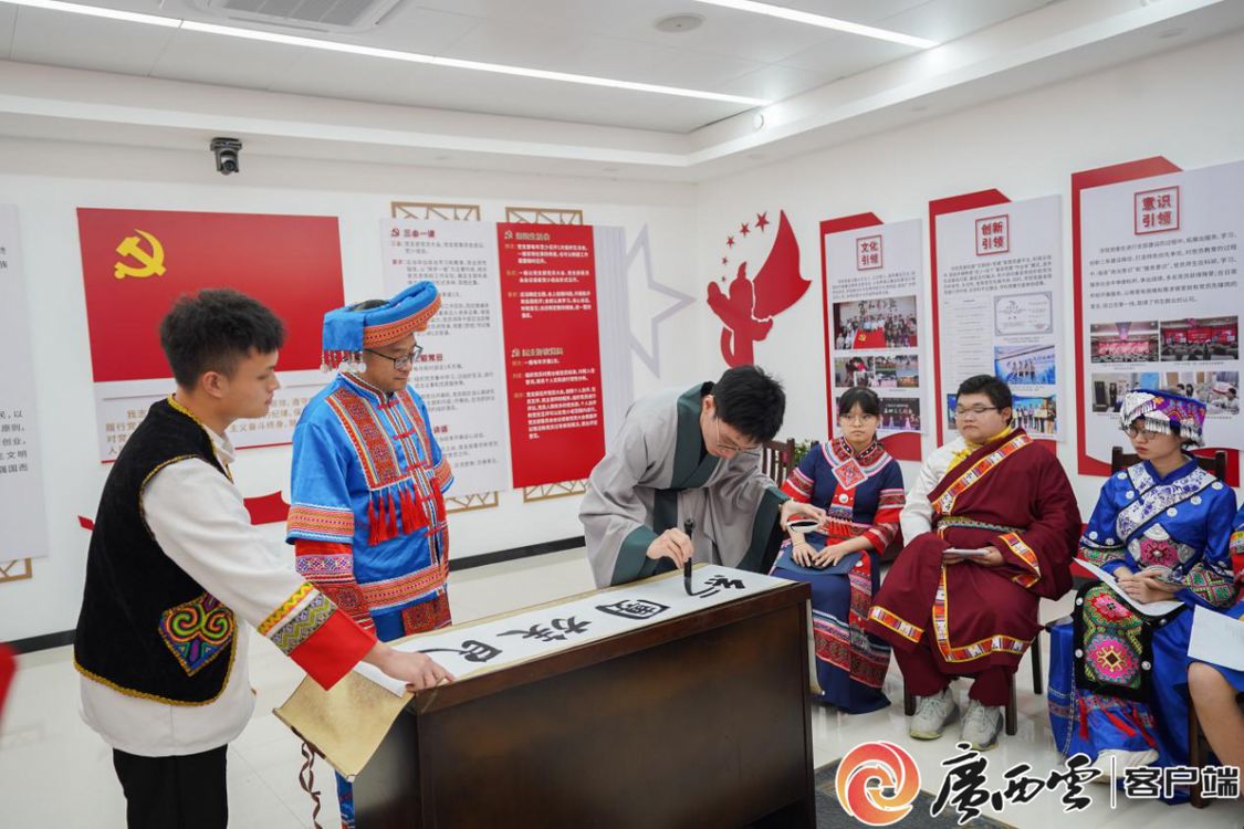 身着壮族传统服饰的学院党委书记罗诚与汉、壮、苗、瑶、仫佬、维吾尔、纳西、傣、满等14个民族的学生代表欢聚一堂,唱支山歌给党听、同心共话民族情。