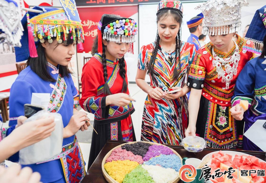 师生们品尝壮族传统美食五色糯米饭。