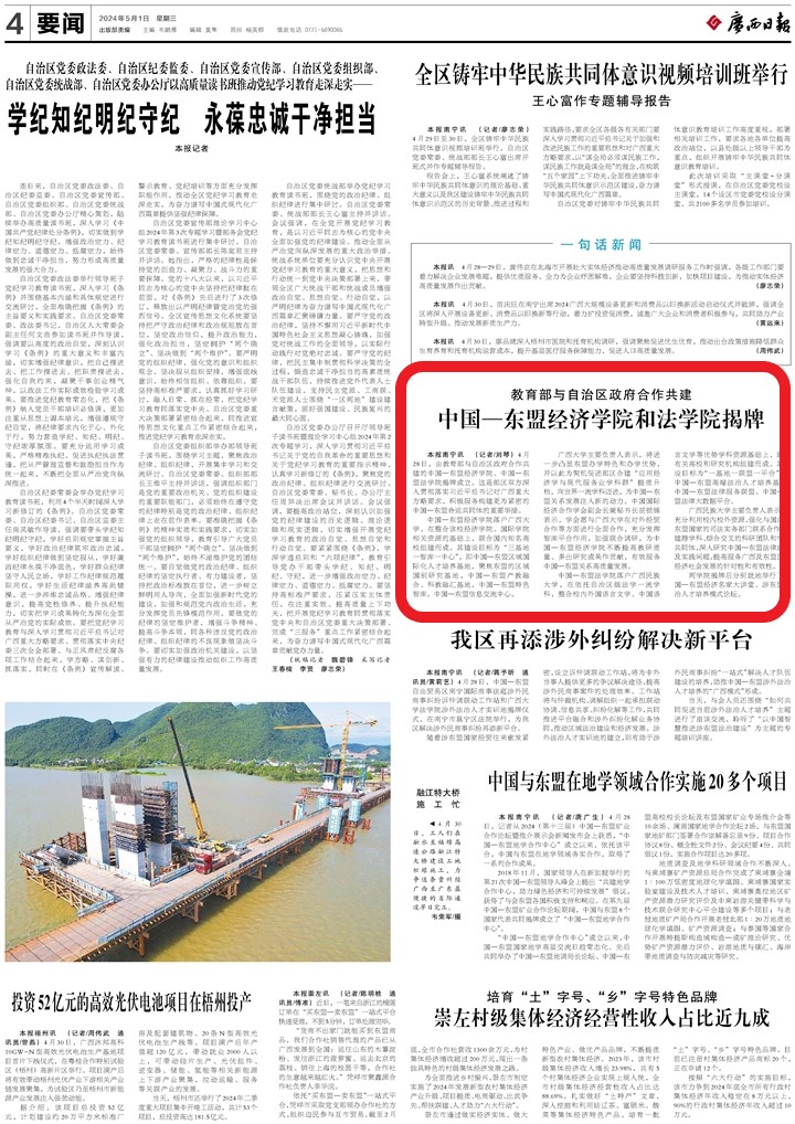 4月28日,由教育部与自治区政府合作共建的中国—东盟经济学院、中国—东盟法学院揭牌成立。这是部区双方深入贯彻落实习近平总书记对广西重大方略要求,积极服务构建更为紧密的中国—东盟命运共同体的重要举措。