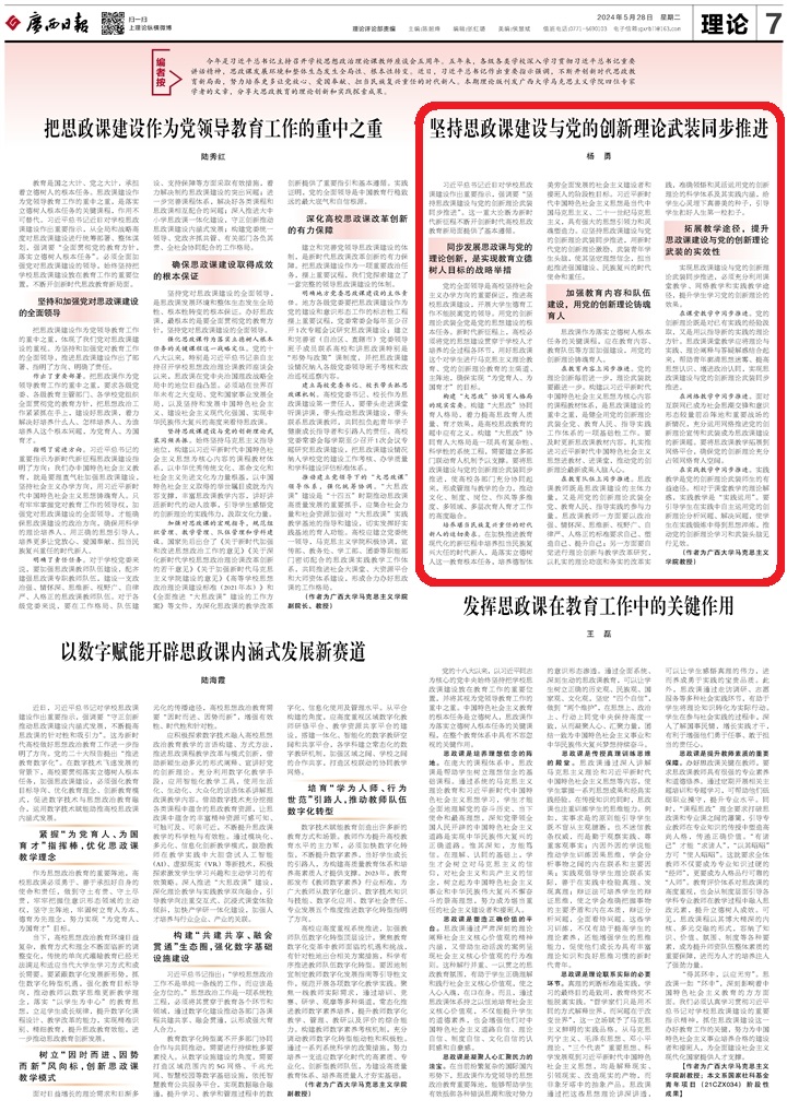 今年是习近平总书记主持召开学校思想政治理论课教师座谈会五周年。五年来,各级各类学校深入学习贯彻习近平总书记重要讲话精神,思政课发展环境和整体生态发生全局性、根本性转变。近日,习近平总书记作出重要指示强调,不断开创新时代思政教育新局面,努力培养更多让党放心、爱国奉献、担当民族复兴重任的时代新人。本期理论版刊发米乐电竞|最新APP下载|登录入口,马克思主义学院四位专家学者的文章,分享大思政教育的理论创新和实践探索成果。