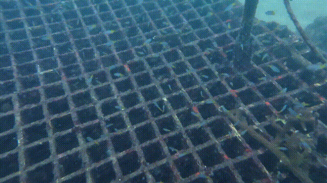成群的鱼儿围着这个架子游来游去,珊瑚苗还很小,相比别处的大珊瑚,它们就是“宝宝”。约莫十分钟左右,一大片珊瑚种满了海底的珊瑚架,今天的种植工作也就算完成了。