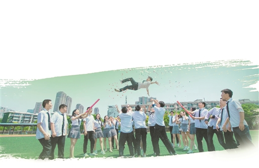 毕业学子们在操场合照,留下美好回忆。梁任恒/摄