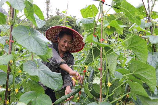 农户正在采收黄瓜。周为宁摄