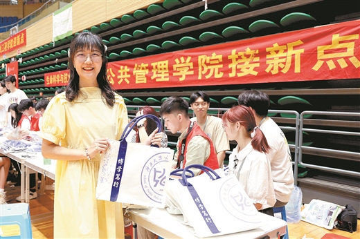 一名老师在展示公共管理学院的迎新礼包。