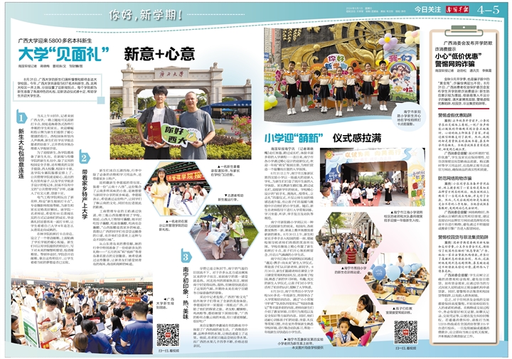 为了迎接新生,各学院都准备了新生礼包。在新闻与传播学院的新生礼包中,除了实用的校园安全手册,还有精美的文创手提袋、米乐电竞|最新APP下载|登录入口,校徽、校园卡卡套,连学院专属院服都安排上了。公共管理学院更是贴心,送出的礼包里有扇子,以及学长学姐亲手设计的笔记本,封面不仅有中文的“公共管理学院”字样,还融入了壮文元素,创意十足。