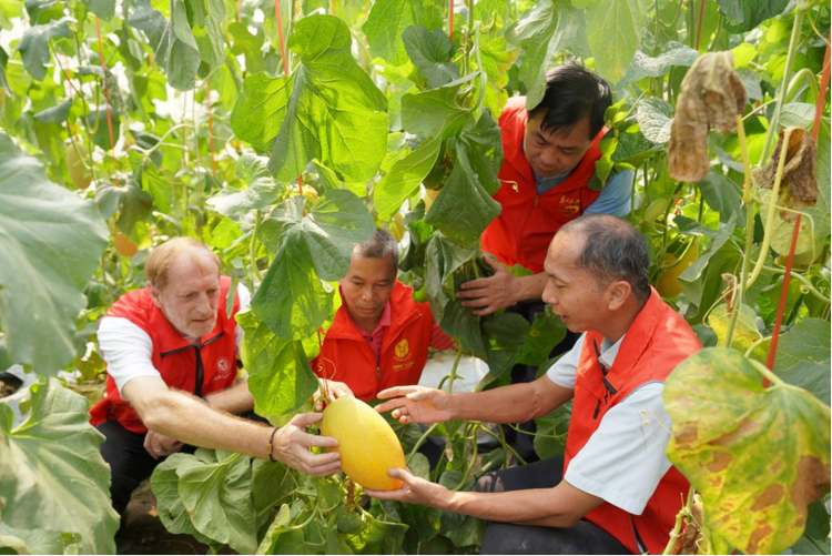 唐小付(左一)向汉森尼科雷内(左二)及谢万举(左三)传授网纹甜瓜种植技术 摄影 高东风
