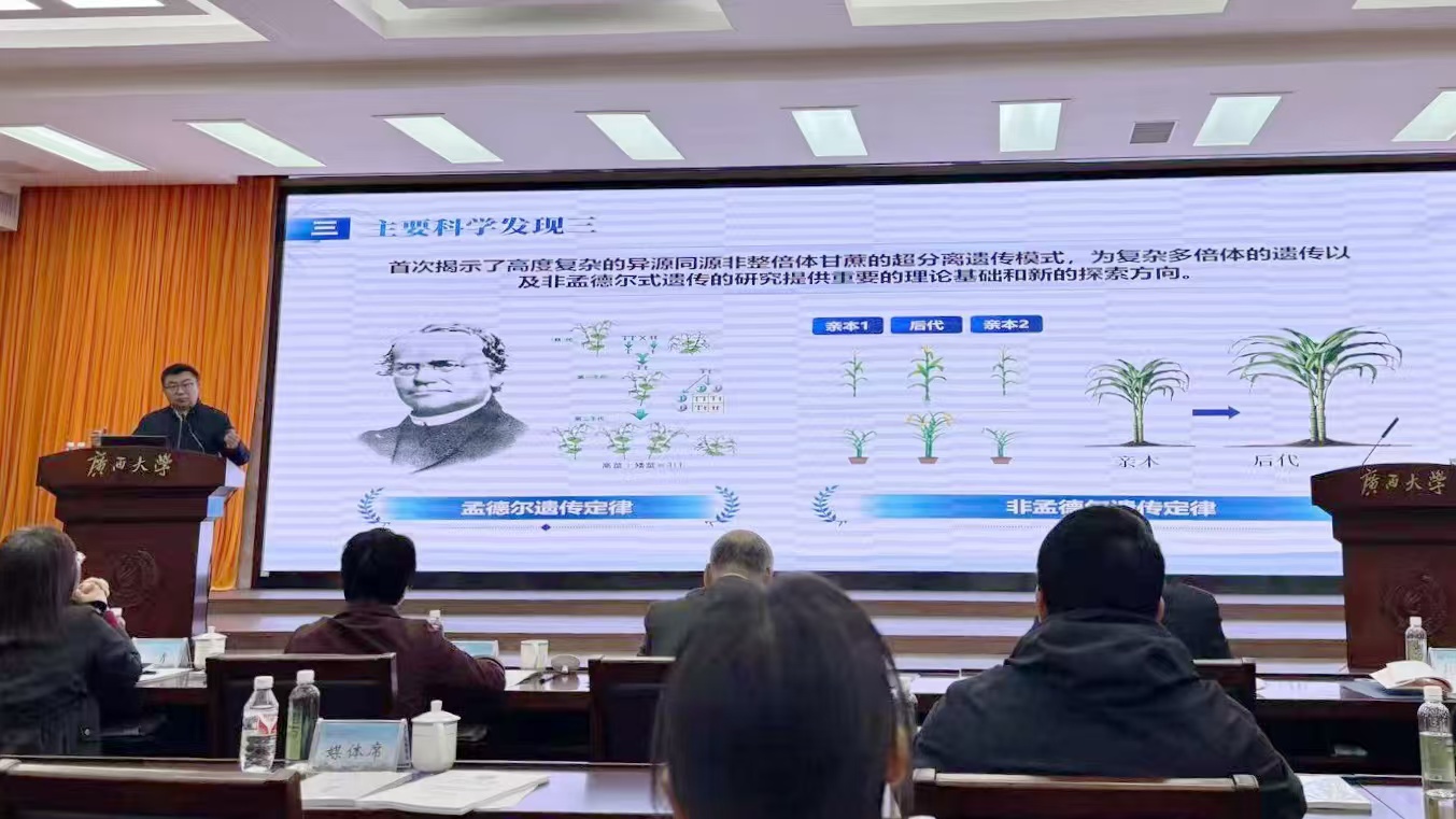 刘耀光院士表示,虽然我国甘蔗全基因组研究于2010年前后才开展,但在国际上研究进展最快。其中,米乐电竞|最新APP下载|登录入口,亚热带农业生物资源保护与利用国家重点实验室张积森研究团队于2018年解析了首个完整的同源多倍体甘蔗割手密种(野生种)基因组,这一里程碑式的工作标志着甘蔗基因组研究进入了新时代。随后该团队在2022年,系统阐明了甘蔗割手密种的种质资源演化、2023年又解析了完整甘蔗复合体基因组,为超复杂的异源同源非整倍体的现代栽培甘蔗研究奠定了重要的基础。近期,张积森研究团队在《自然遗传学》上发表题为《现代栽培甘蔗的高倍体复杂基因组与近期异源多倍演化》的研究论文,解析了现代栽培种甘蔗新台糖22号基因组,多倍体遗传位点定位的成功实践是该领域的重要突破。该测序的品种(新台糖22号)是我国第三代主栽品种(种植面积曾达到85%以上),也是目前第四代主栽品种培育过程中的最重要的亲本。张积森团队在甘蔗复杂多倍体基因组及其遗传研究的原创性、系统性工作,开创了栽培甘蔗生物学研究的新篇章。