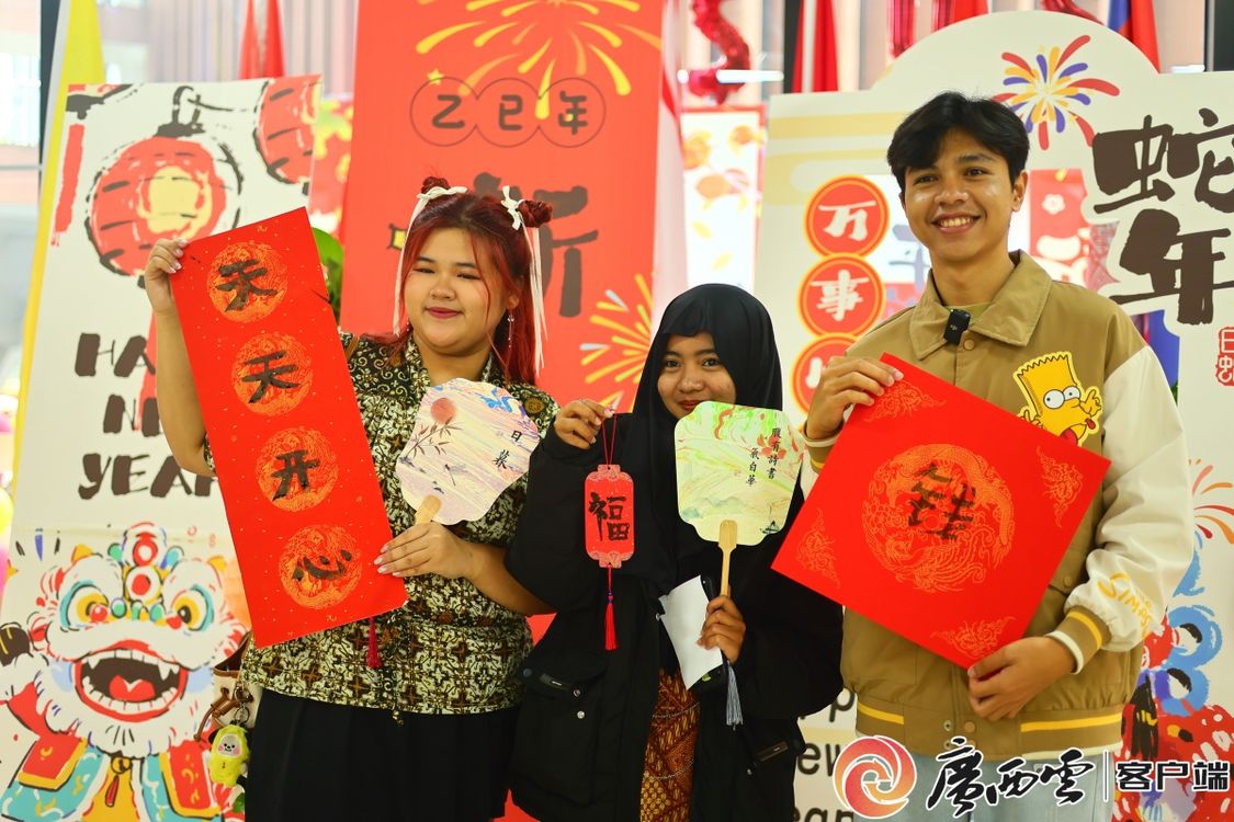 活动当天,正值中国南方小年,游园现场年味十足,不仅有漆扇制作、画脸谱、写春联、投壶等项目,还布置了精心设计的蛇年拍照板,吸引了近300名中外师生参与。
