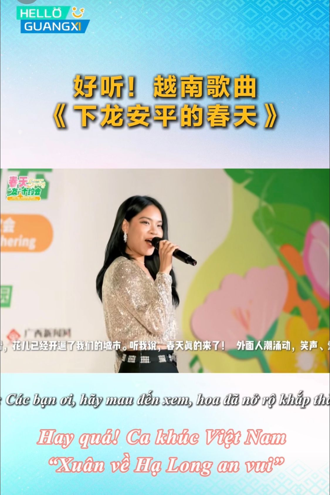 广西艺术学院的越南留学生们在由广西国际传播中心主办,广西云数字媒体集团承办的“春天‘友’个约会”2025中国—东盟青年春日联欢会上大放异彩。裴香银作词作曲并深情演唱《下龙安平的春天》,如清泉般的歌声让人感受到越南春日的美好;她还与武秋安合唱了越南语版的《青花瓷》,柔美的声线与中国风歌词交织,令人耳目一新。