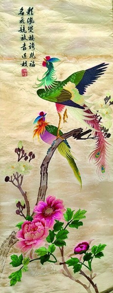 综合来看,该绣品大约在20世纪二三十年代问世。“湘绣”作为中国四大名绣之一,在这个时期正处于鼎盛期。1935年,《西湖博览会总报告书》“绣品”一节中,湘绣就占了一半的篇幅。湖南并非沿海地区,却在绣品中表现了海外珍禽名花,既可见中西交流的繁盛,更说明中华优秀传统文化的开放包容和日新又新。