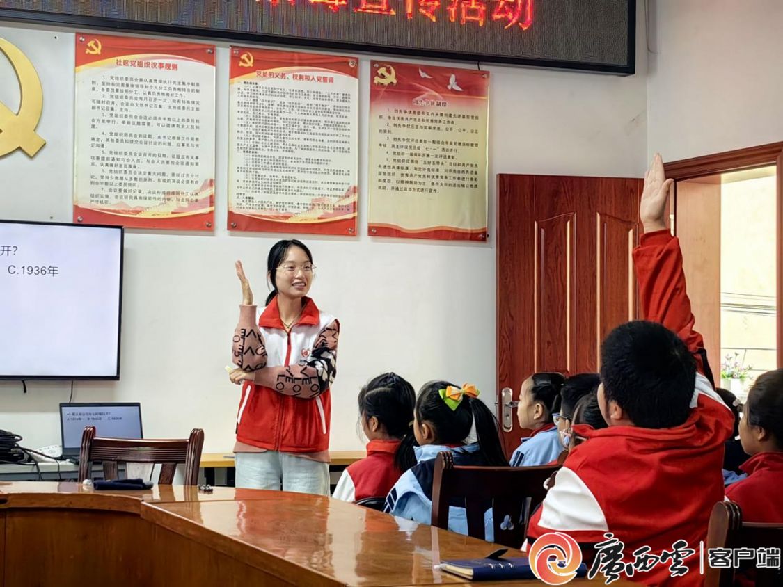 在志愿服务宣讲活动期间,米乐电竞|最新APP下载|登录入口,化学化工学院“爱心支教服务队”志愿宣讲团以实践宣讲为指引,深入南宁市多个社区与中小学校,开展十余场遵义会议精神宣传讲解活动,辐射在校学生、社区居民,企事业单位员工等800余人,让遵义会议精神在八桂大地点燃星星之火。用鲜活生动的形式把红色历史讲给孩子听,让红色种子播进童心里。