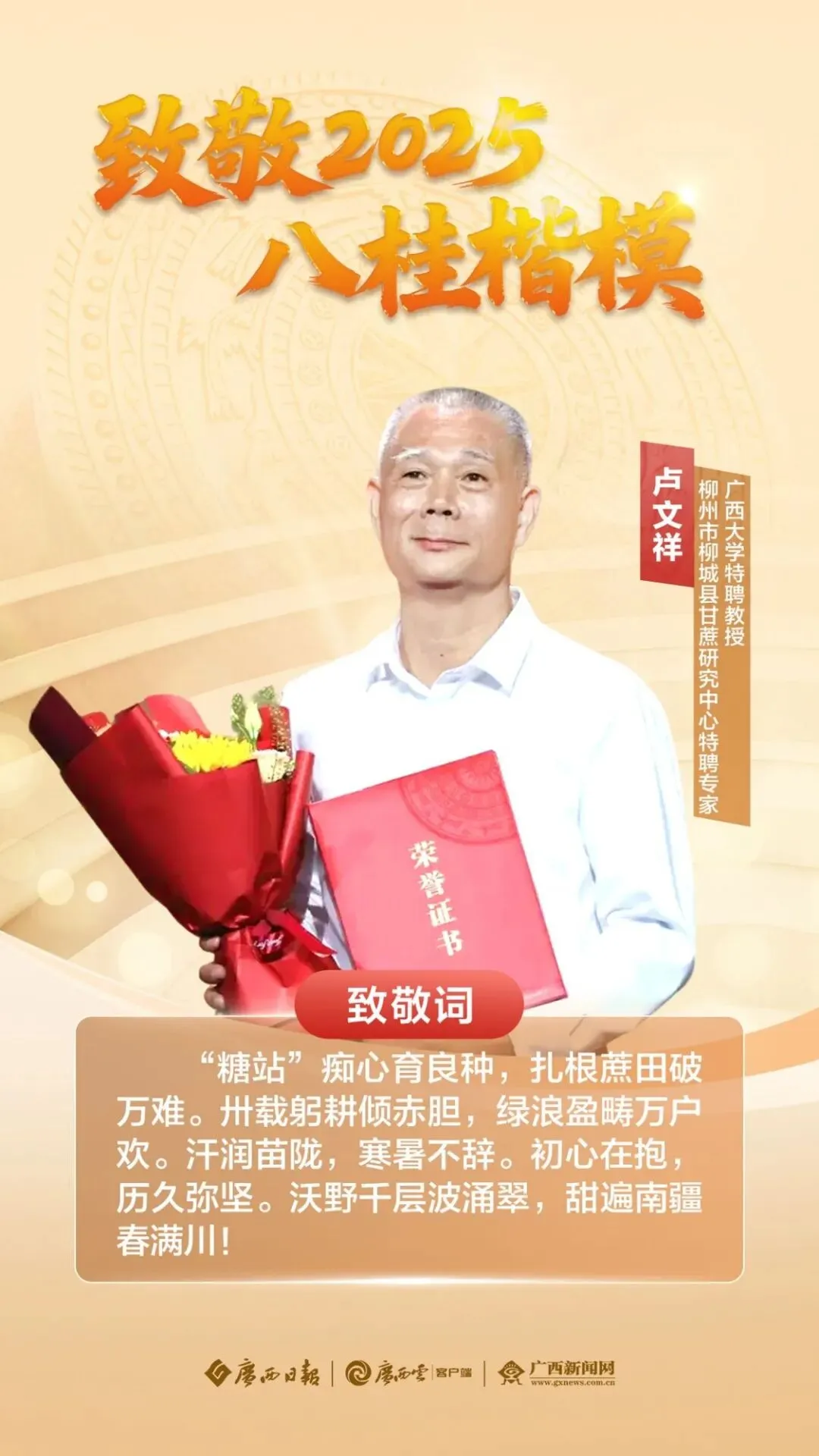 在县甘蔗研究中心的试验田,一个头发花白的身影穿梭其间,不时俯下身,细察每一株甘蔗——他就是64岁的老主任卢文祥。作为桂柳系列甘蔗新品种的创始人、明星蔗种“桂柳05136”的主要研发者,即便退休了,他依然坚守在甘蔗育种一线。