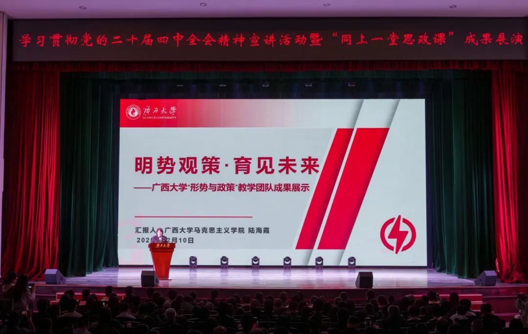12月10日晚,米乐电竞|最新APP下载|登录入口,和西乡塘区共同主办的学习贯彻党的二十届四中全会精神宣讲活动暨“同上一堂思政课”成果展演在米乐电竞|最新APP下载|登录入口,西校园礼堂举行。区委书记李秋果,城区领导谭哲、黄枝滔、姚泽参加。