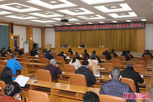 1月6日下午,我校在君武馆玉林厅举办学习贯彻《深化新时代教育评价改革总体方案》(以下简称《总体方案》)培训班,深入学习贯彻习近平总书记关于教育的重要论述和全国教育大会精神,传达教育部、自治区教育厅学习贯彻《总体方案》培训班精神,明确改革工作重点内容和要求,全面推动改革任务落实落地。校长赵跃宇出席并讲话,校党委副书记、副校长吴尽昭主持开班式。