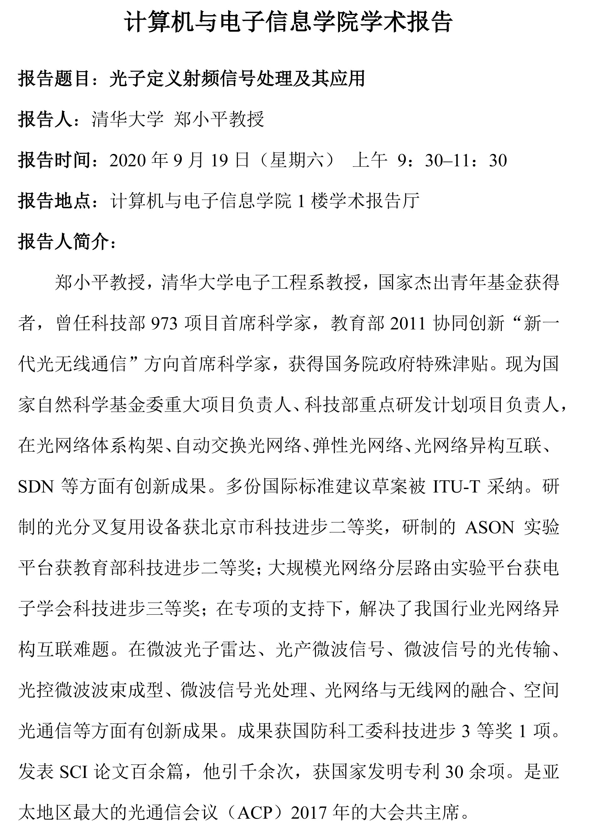 计算机与电子信息学院学术报告:光子定义射频信号处理及其应用