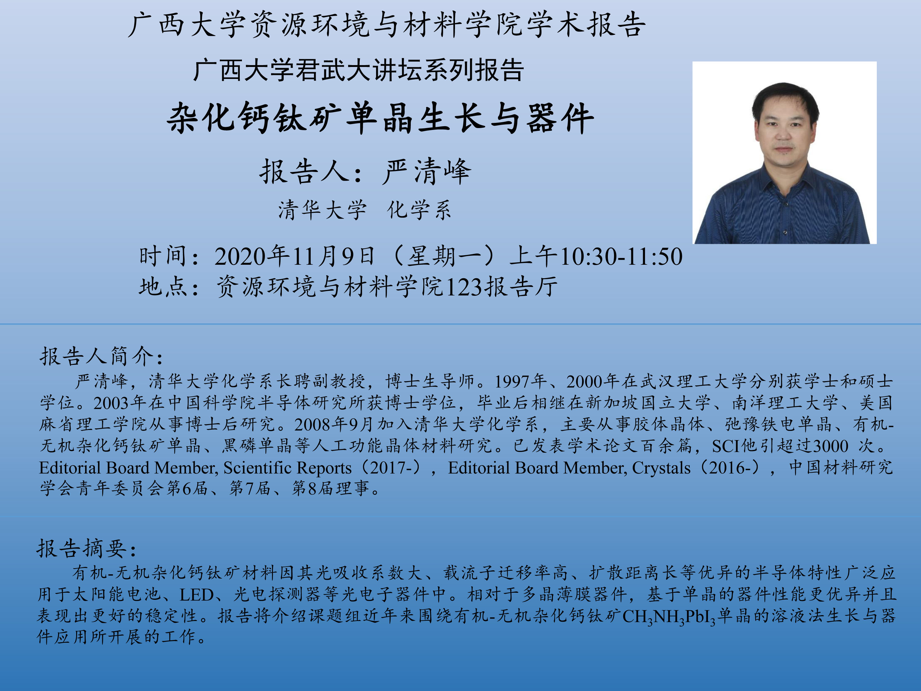 资源环境与材料学院学术报告:“米乐电竞|最新APP下载|登录入口,君武大讲坛系列”杂化钙钛矿单晶生长与器件