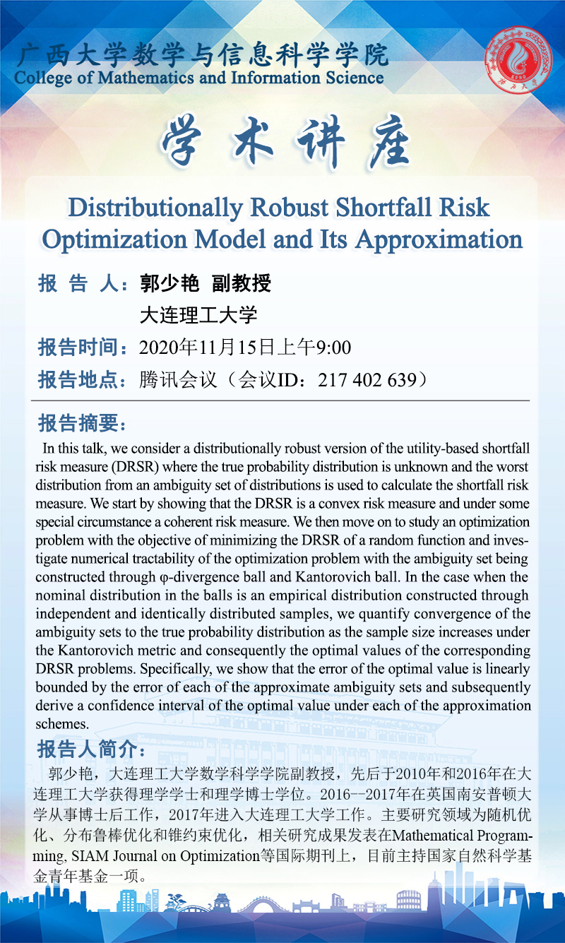 数学与信息科学学院学术讲座:Distributionally Robust Shortfall Risk Optimization Model and Its Approximation