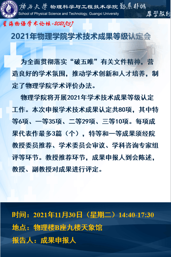 物理学院星海物语学术论坛(第十三期):2021年物理学院学术技术成果等级认定会