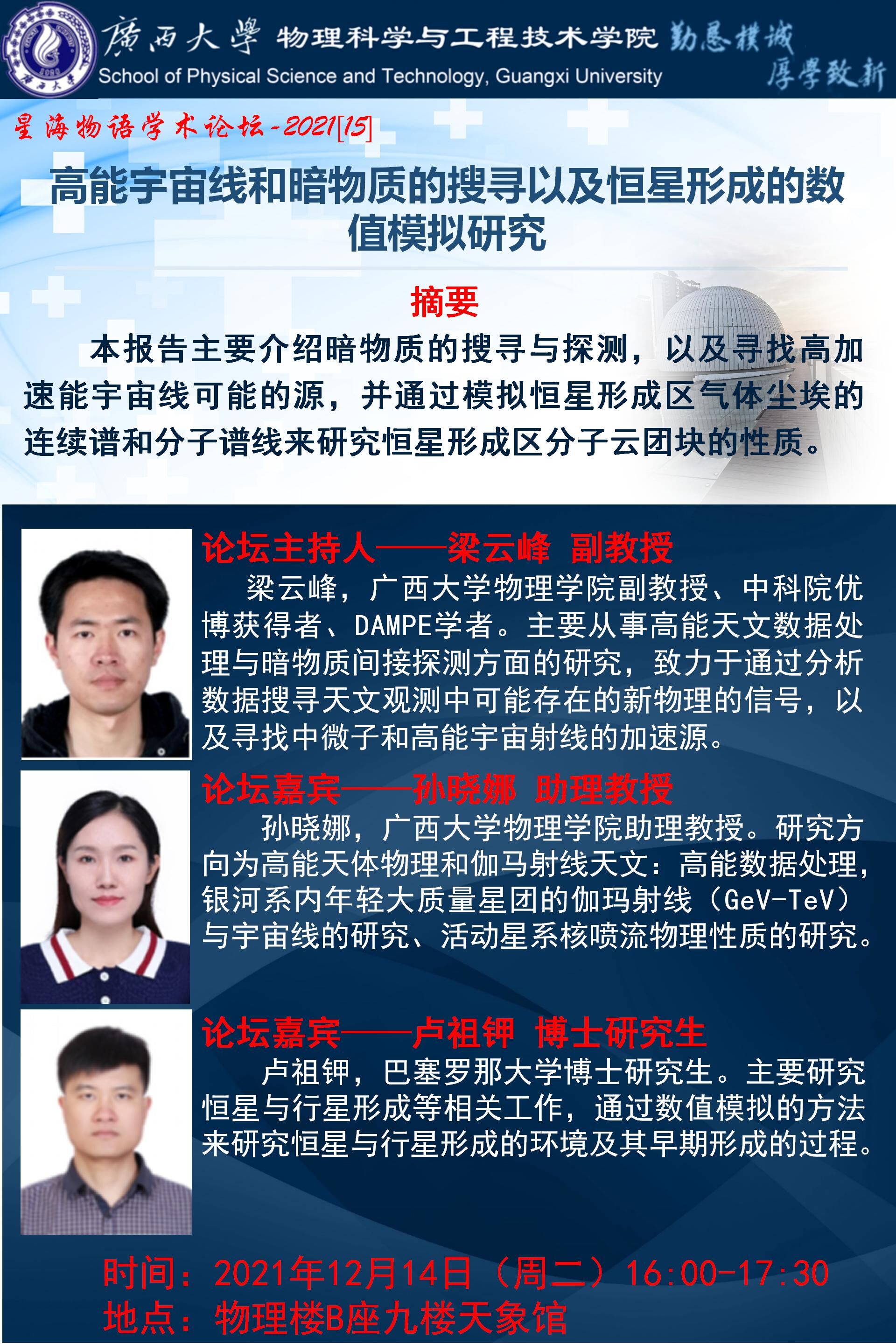 物理学院星海物语学术论坛(第十五期):高能宇宙线和暗物质的搜寻以及恒星形成的数值模拟研究