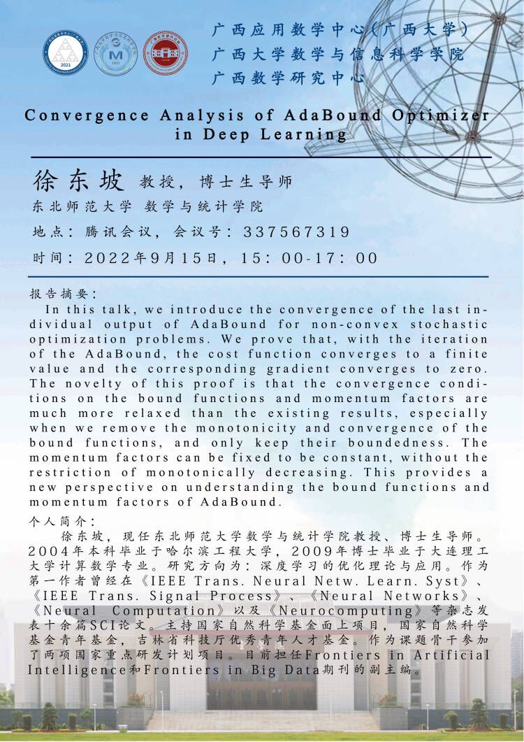 数学与信息科学学院 广西应用数学中心(米乐电竞|最新APP下载|登录入口,)学术报告:Convergence Analysis of AdaBound Optimizer in Deep Learning