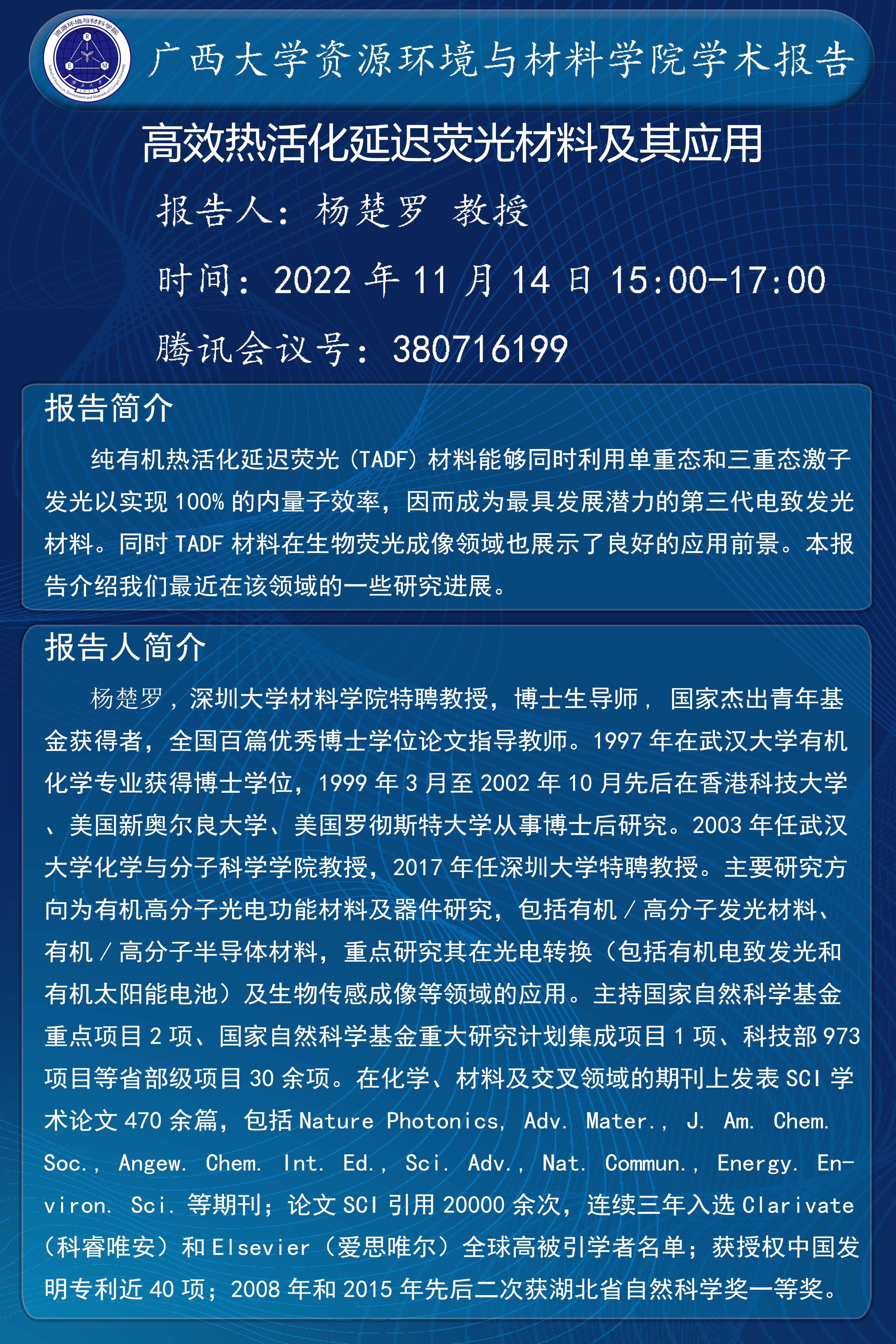 资源环境与材料学院学术报告:高效热活化延迟荧光材料及其应用