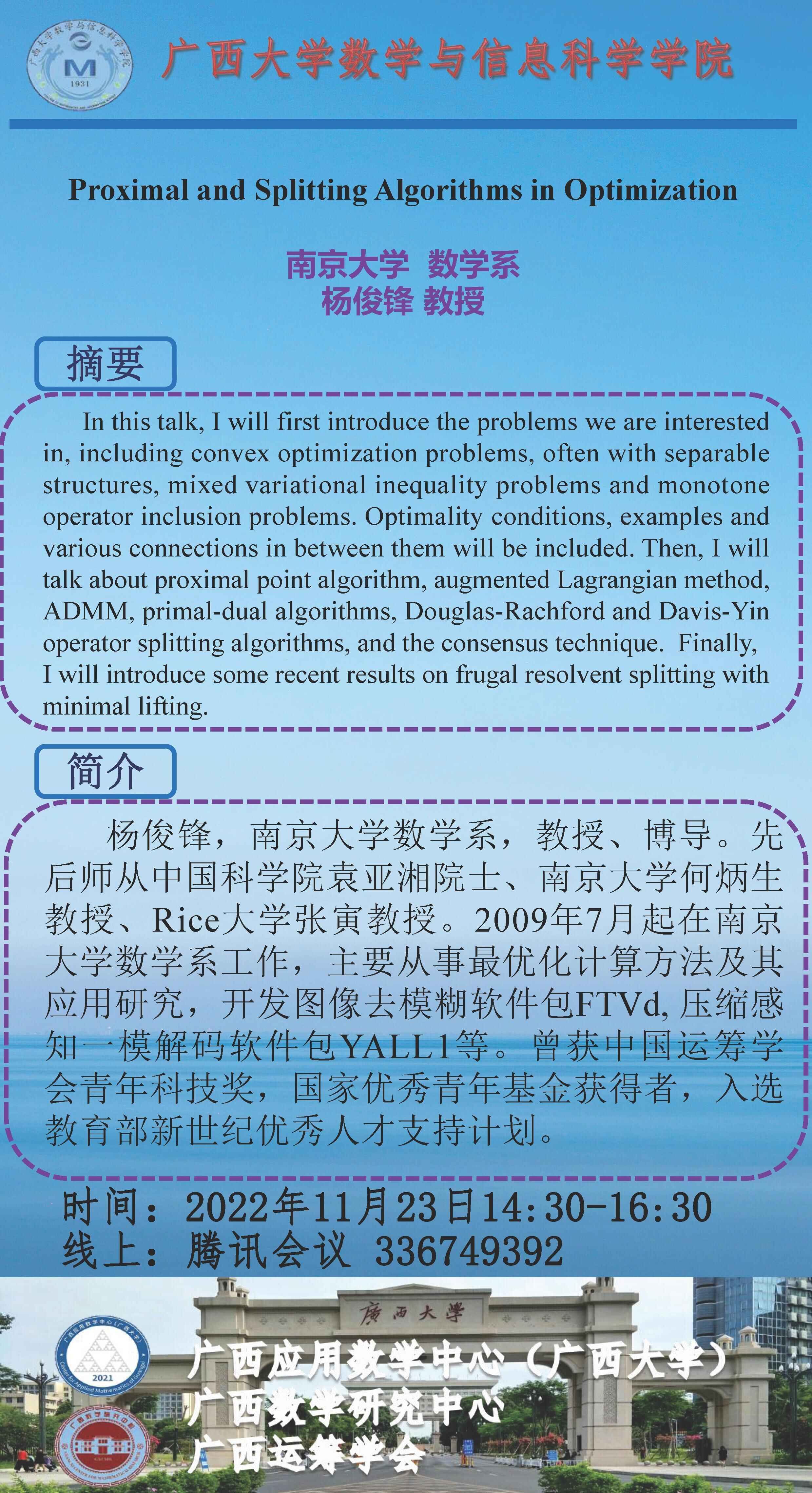 数学与信息科学学院/广西应用数学中心(米乐电竞|最新APP下载|登录入口,)学术报告Proximal and Splitting Algorithms in Optimization