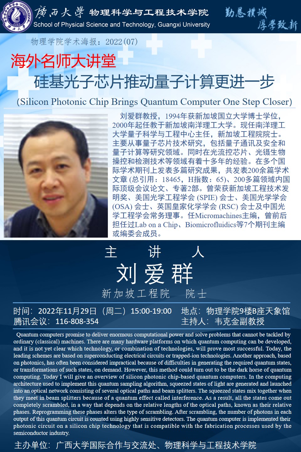 物理科学与工程技术学院 海外名师大讲堂 硅基光子芯片推动量子计算更进一步(Silicon Photonic Chip Brings Quantum Computer One Step Closer)