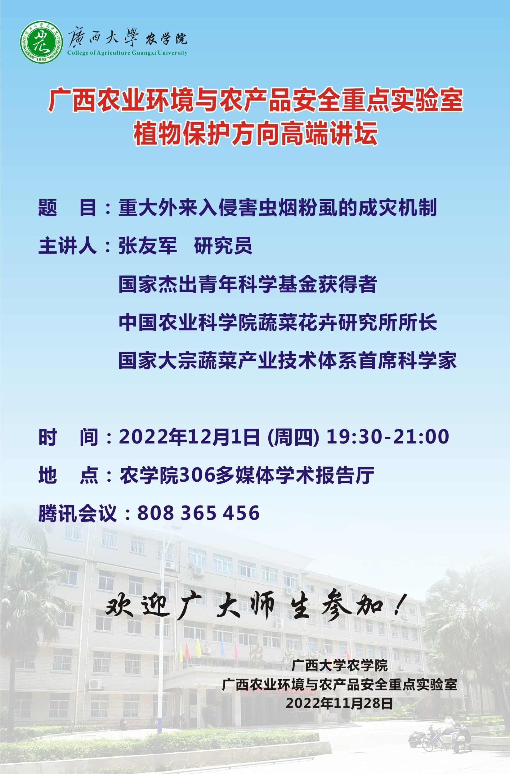 广西农业环境与农产品安全重点实验室 植物保护方向高端讲坛 重大外来入侵害虫烟粉虱的成灾机制