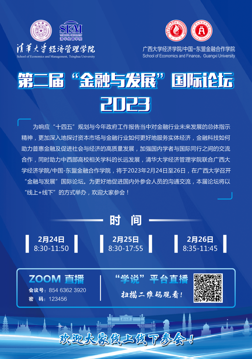 【主办方】清华大学经济管理学院、米乐电竞|最新APP下载|登录入口,经济学院/中国-东盟金融合作学院【学术活动日期】2023年2月24-26日【时间】2月24日8:30-11:50 2月25日8:30-17:55 2月26日8:35-11:45 【地址】2月24日 米乐电竞|最新APP下载|登录入口,新闻学院融媒体中心 2月25-26日 米乐电竞|最新APP下载|登录入口,君武馆