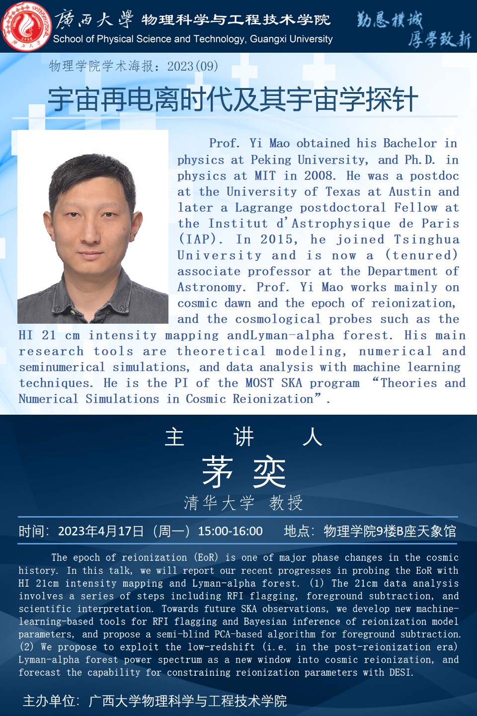 物理学院2023年学术报告系列之09:宇宙再电离时代及其宇宙学探针