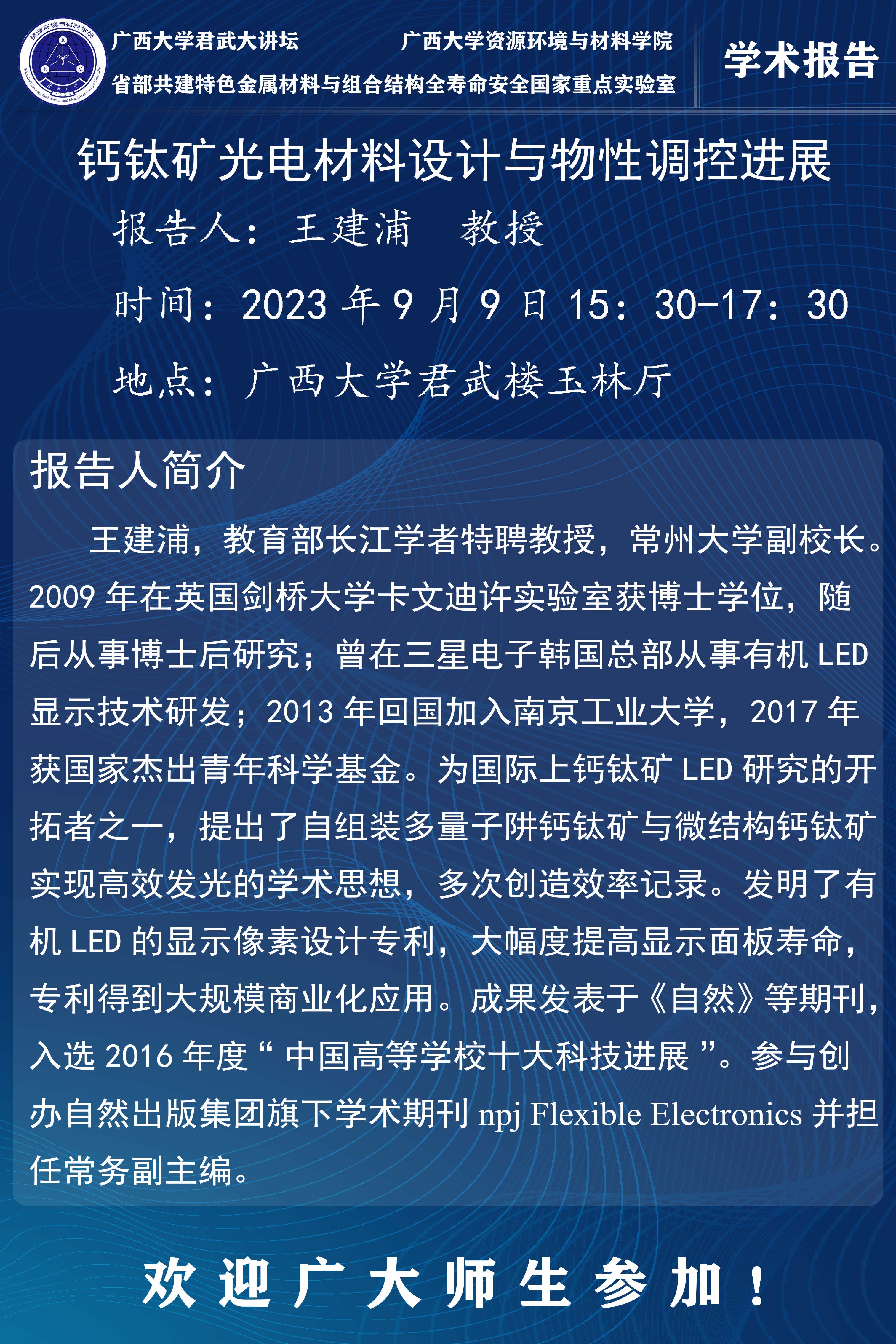 米乐电竞|最新APP下载|登录入口,君武大讲坛、资源环境与材料学院学术报告:钙钛矿光电材料设计与物性调控进展